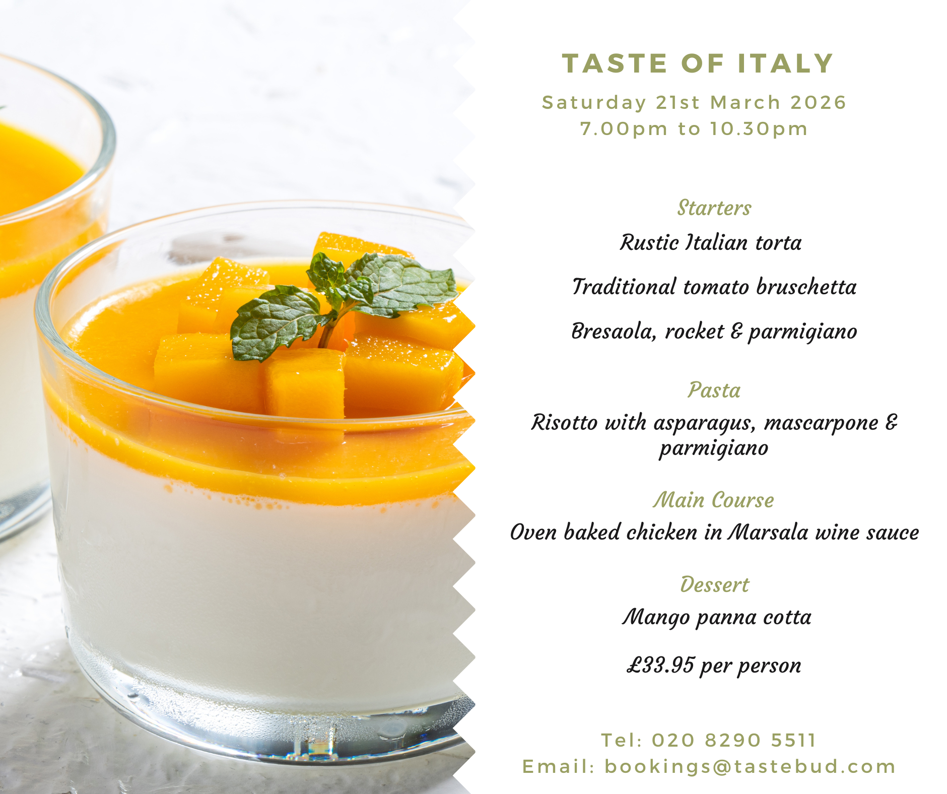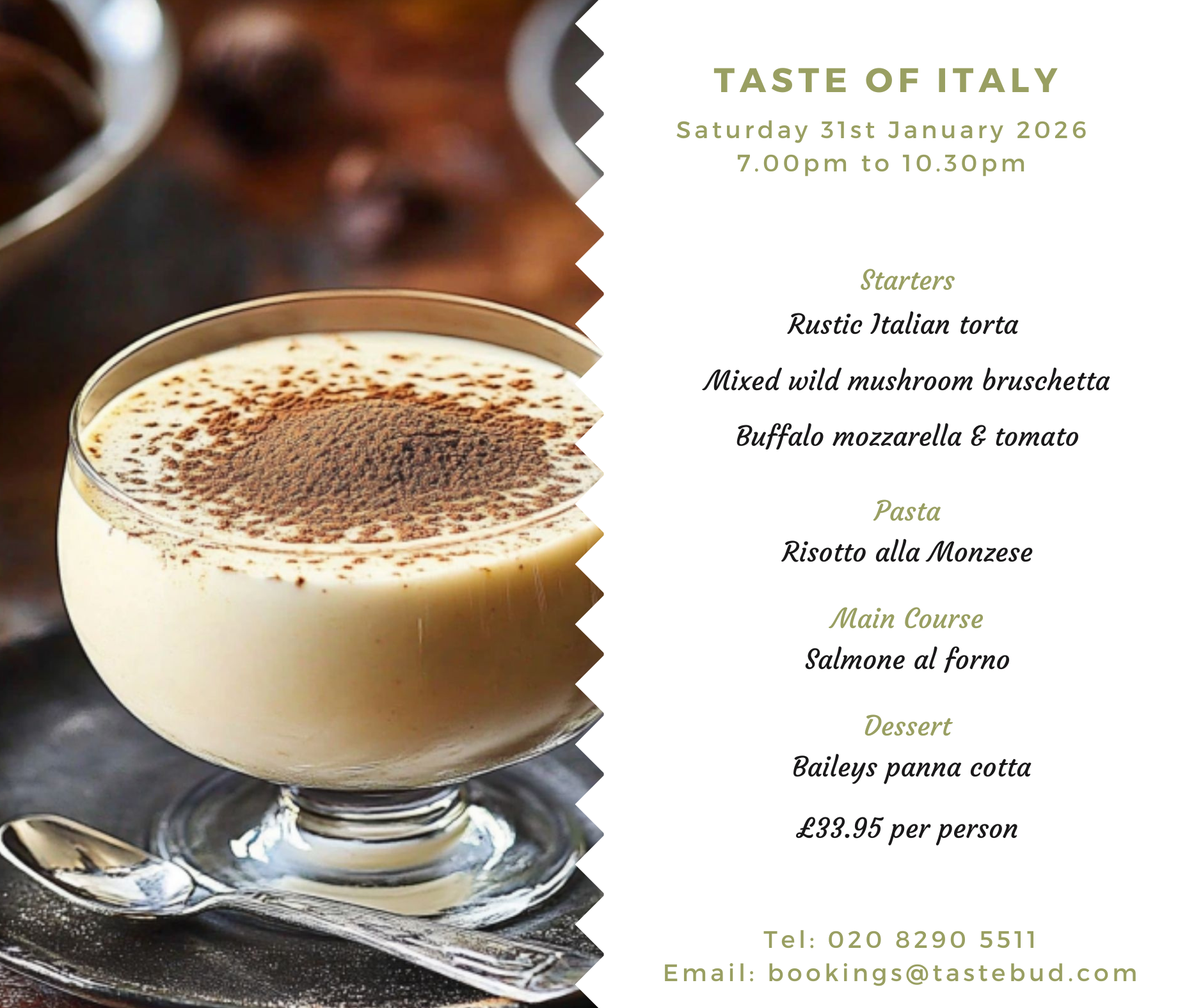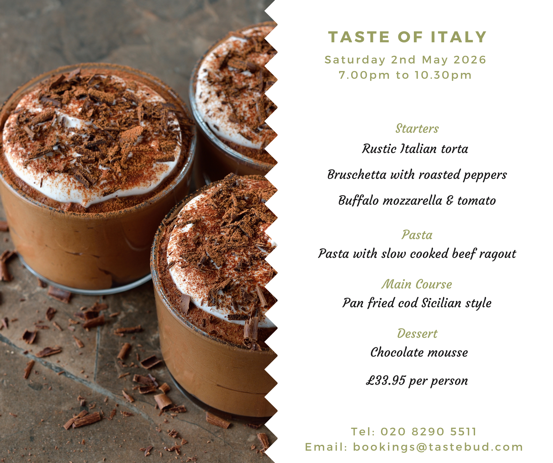 At Taste Bud, we host monthly Taste of Italy evenings, usually on the last weekend of the month, from 7pm to 10.30pm.